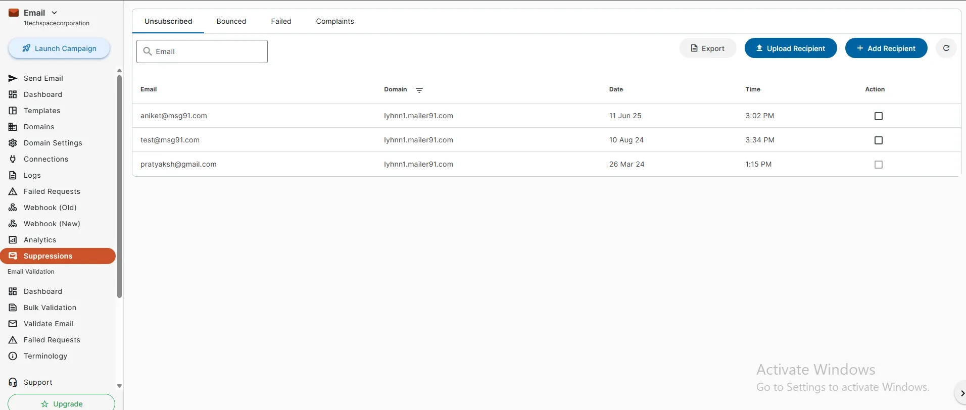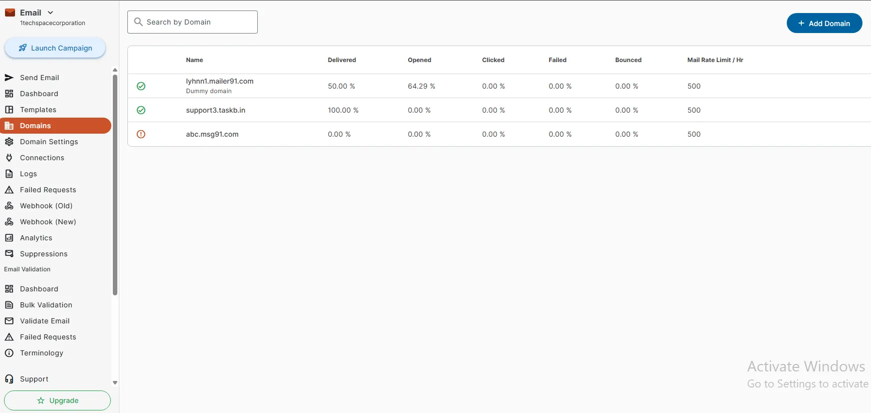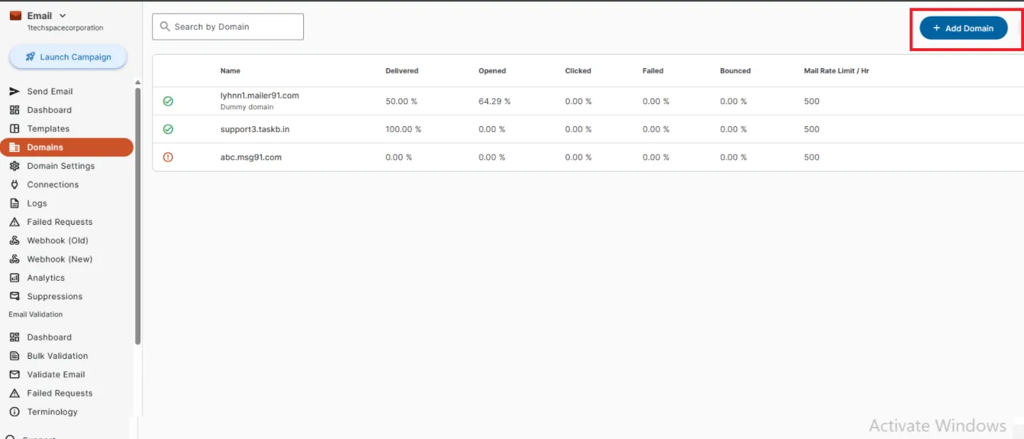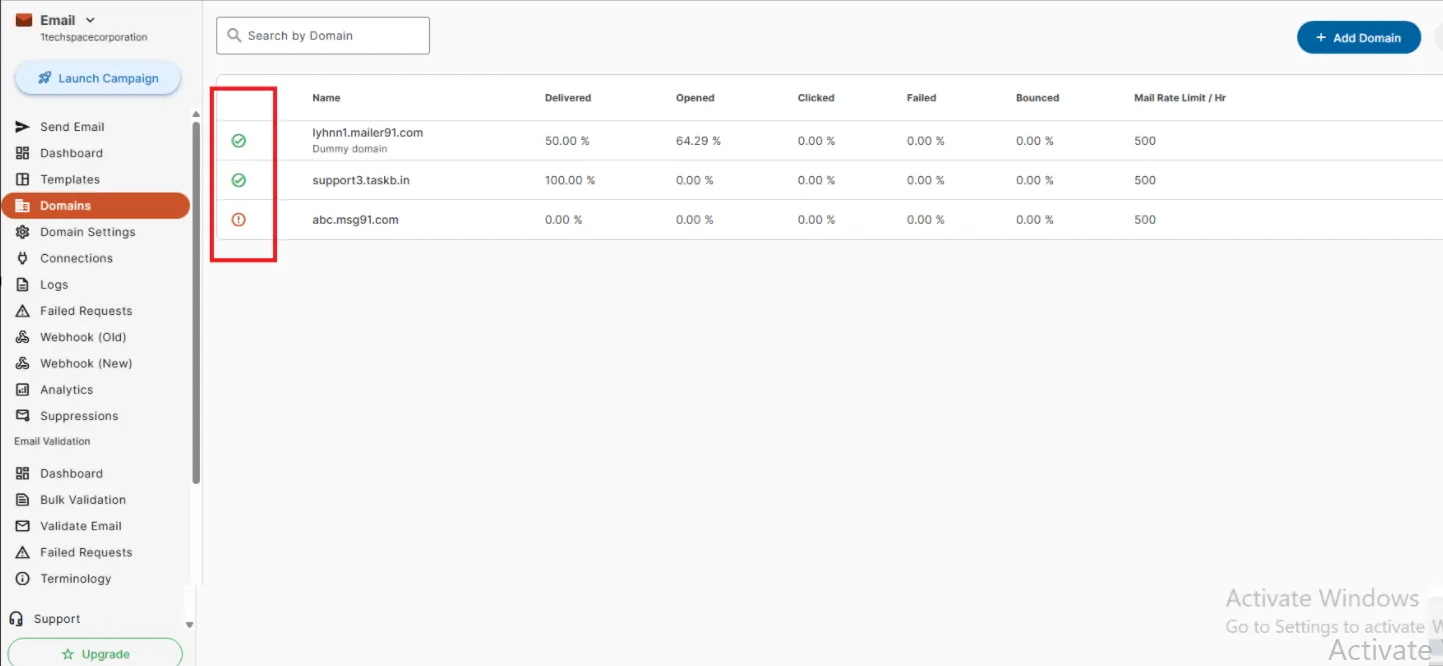 Note: You cannot delete a domain even if one email has been sent from that domain ID because it will create problems in the reports section.
