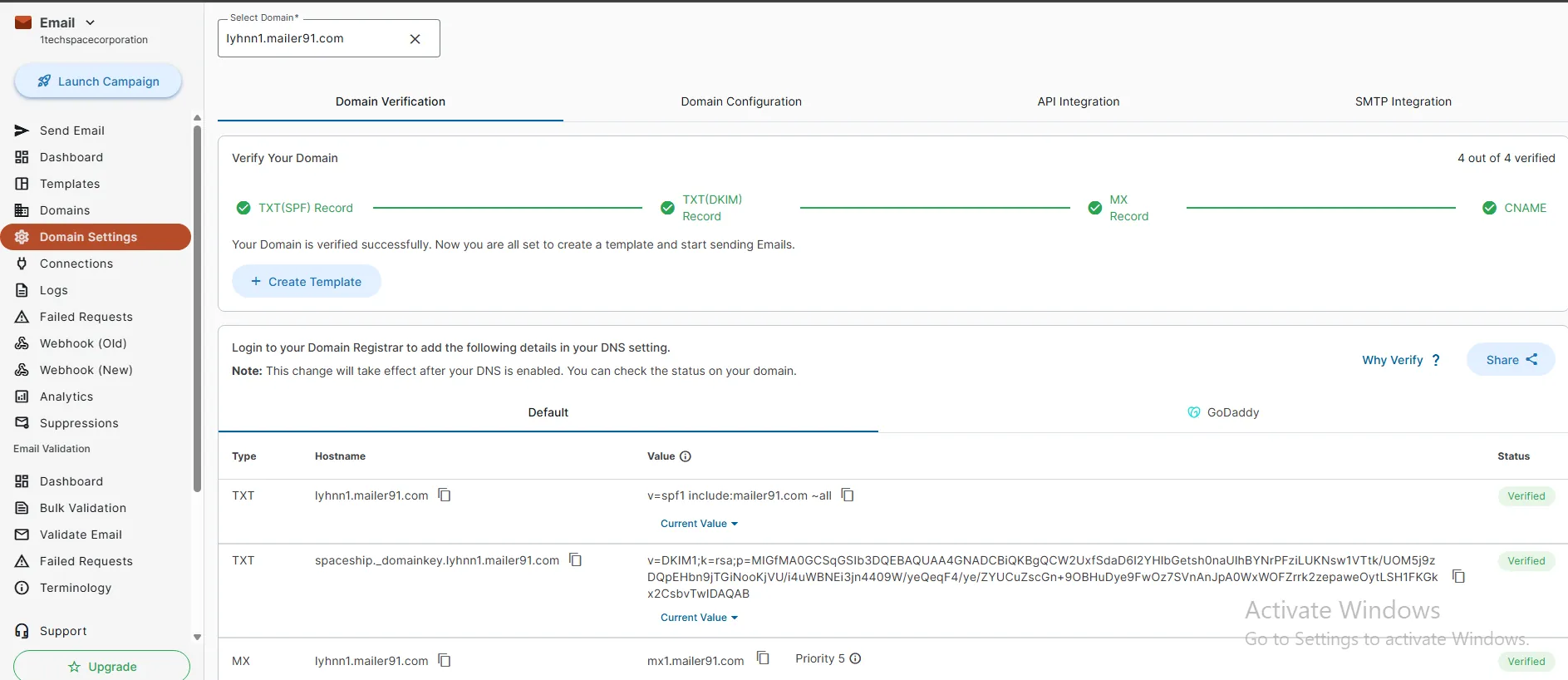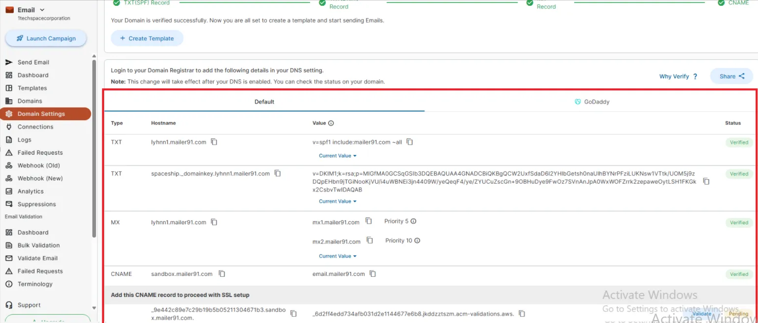 5) After you verify the current value from the domain there will be a green tick and it will show your DNS verified.