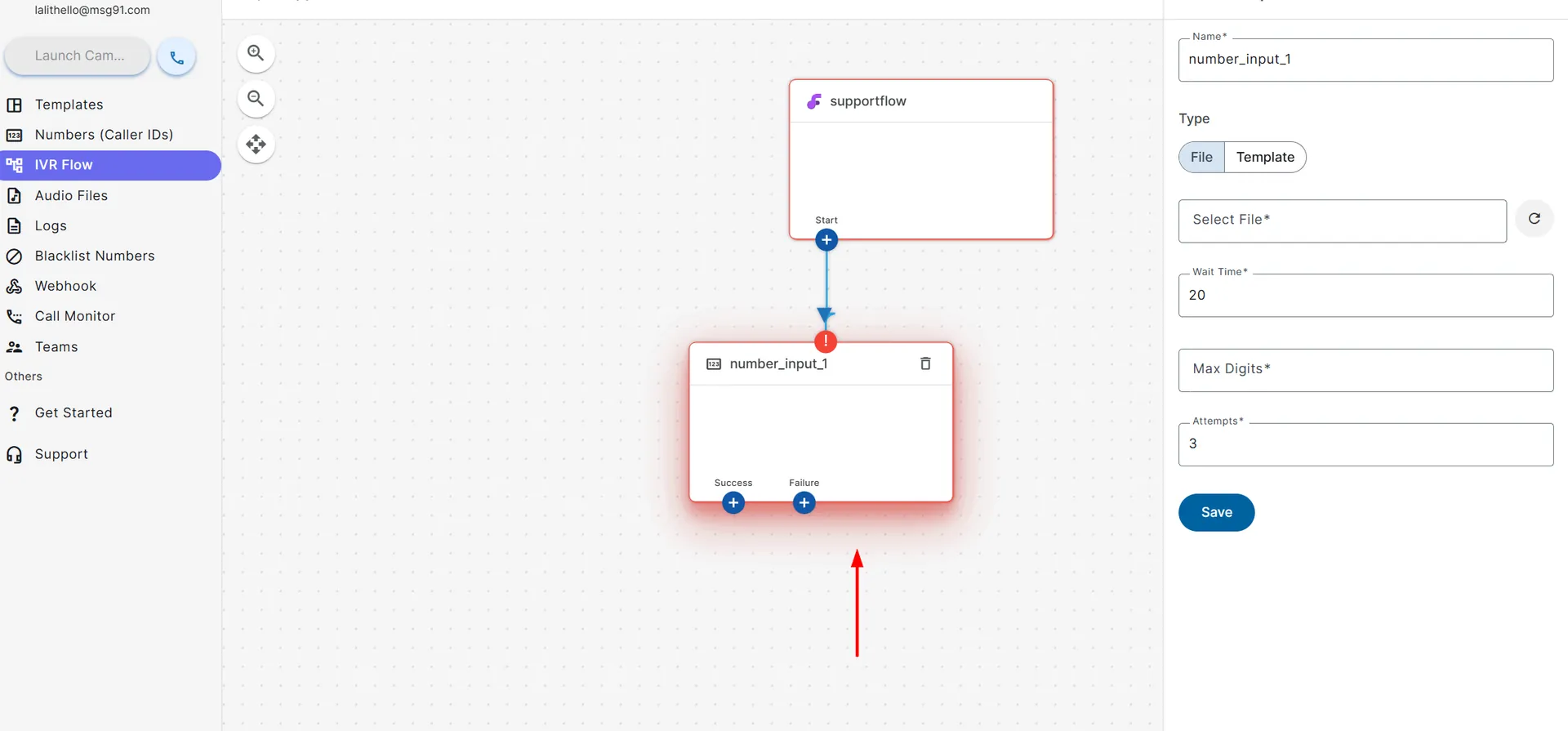 3.)Number Input Node: The Number Input Node is a valuable tool designed for the collection of Dual-Tone Multi-Frequency (DTMF) inputs during communication flows. It offers a range of customizable settings to enhance your interactive communication with the audience. By using the Number Input Node and configuring these settings to your preference, you can create engaging, interactive communication flows that are responsive to your audience's input, and that guide them through the process with clarity and flexibility.