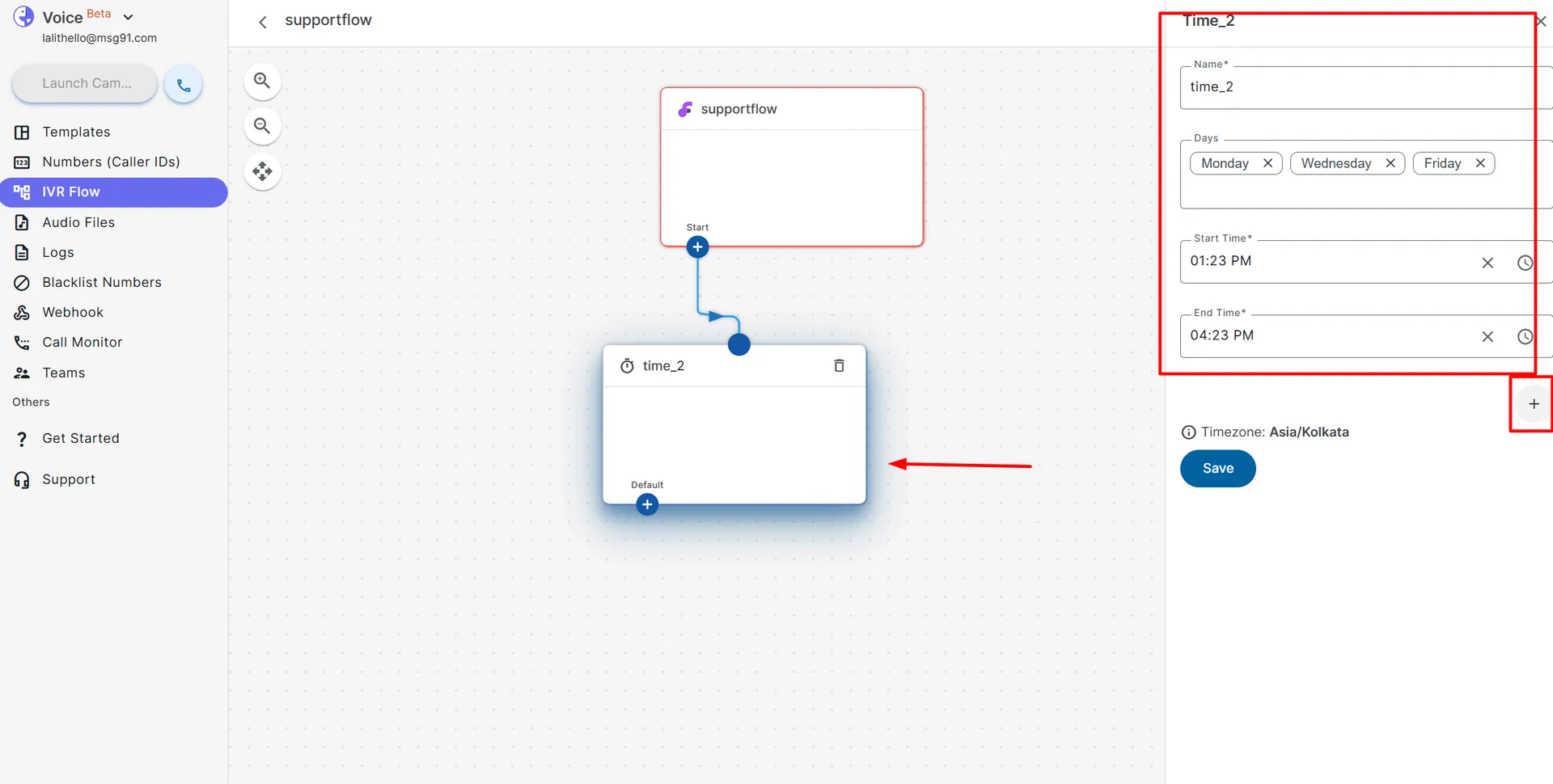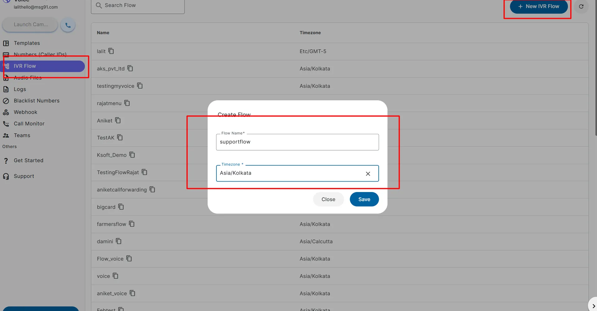 Now go to IVR flow and create a new flow by entering your flow name and timezone: