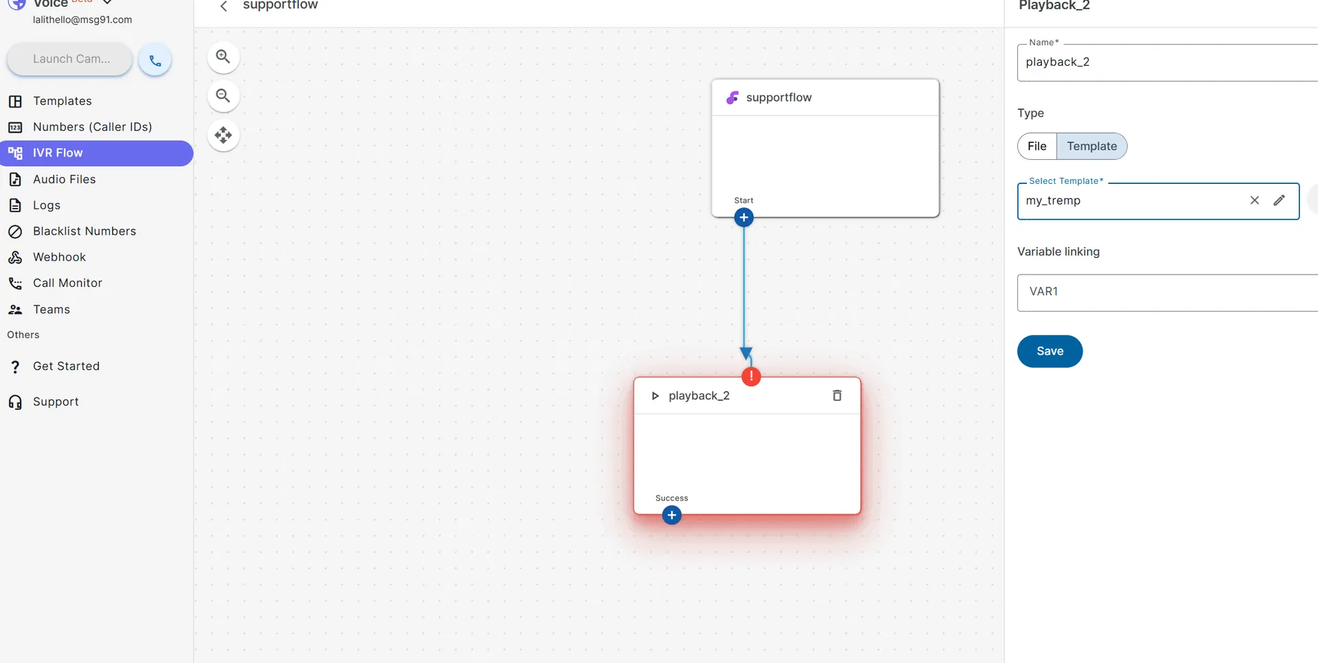 You can add template or file in flow from the Number Input Node and Playback Node in order to play IVR files. Templates can also play dynamic variables.