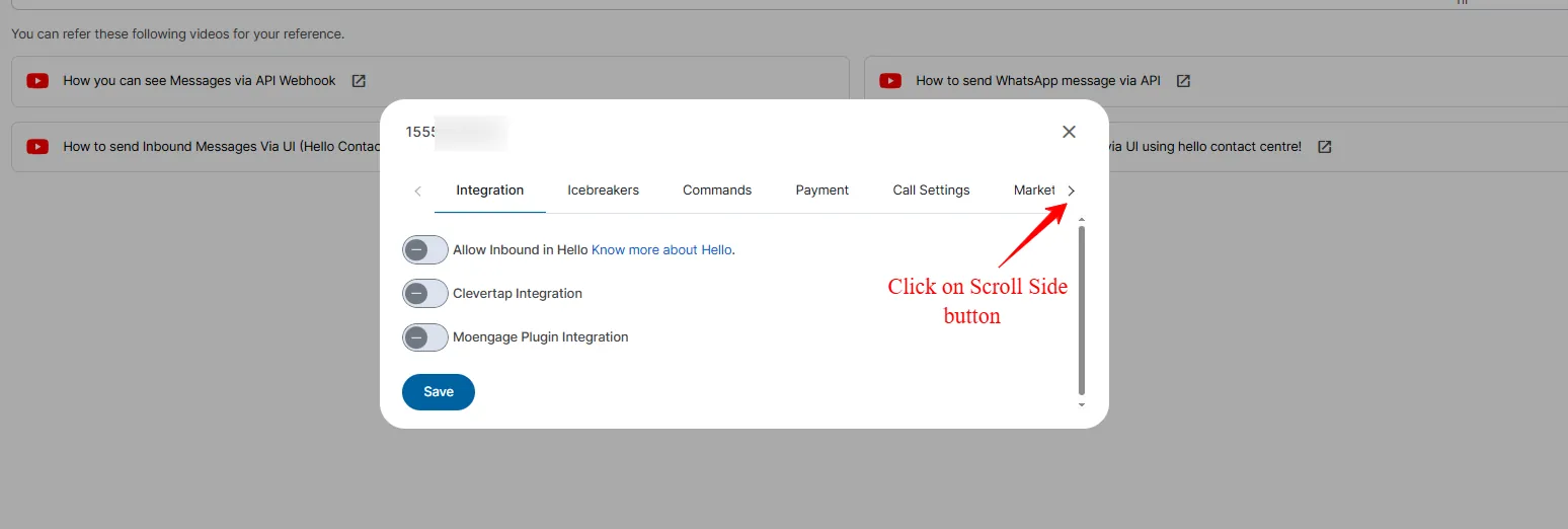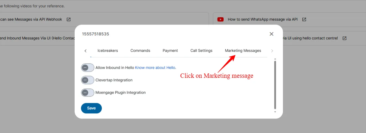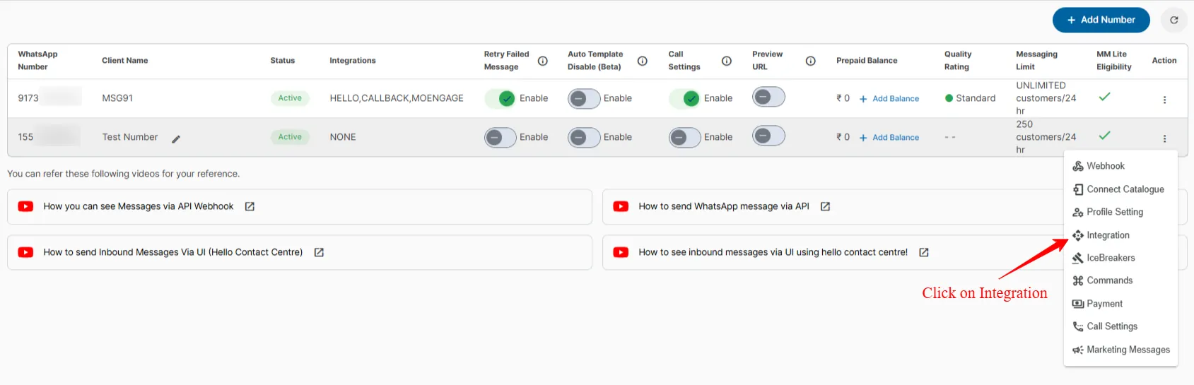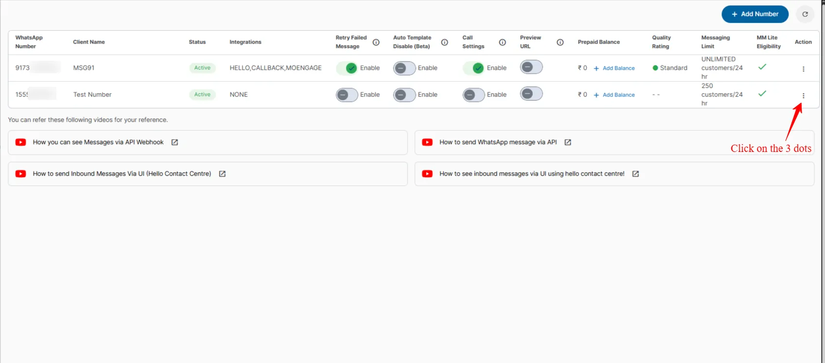 Click on the 3 Dots of the number on which you want to start the advance marketing messages services.