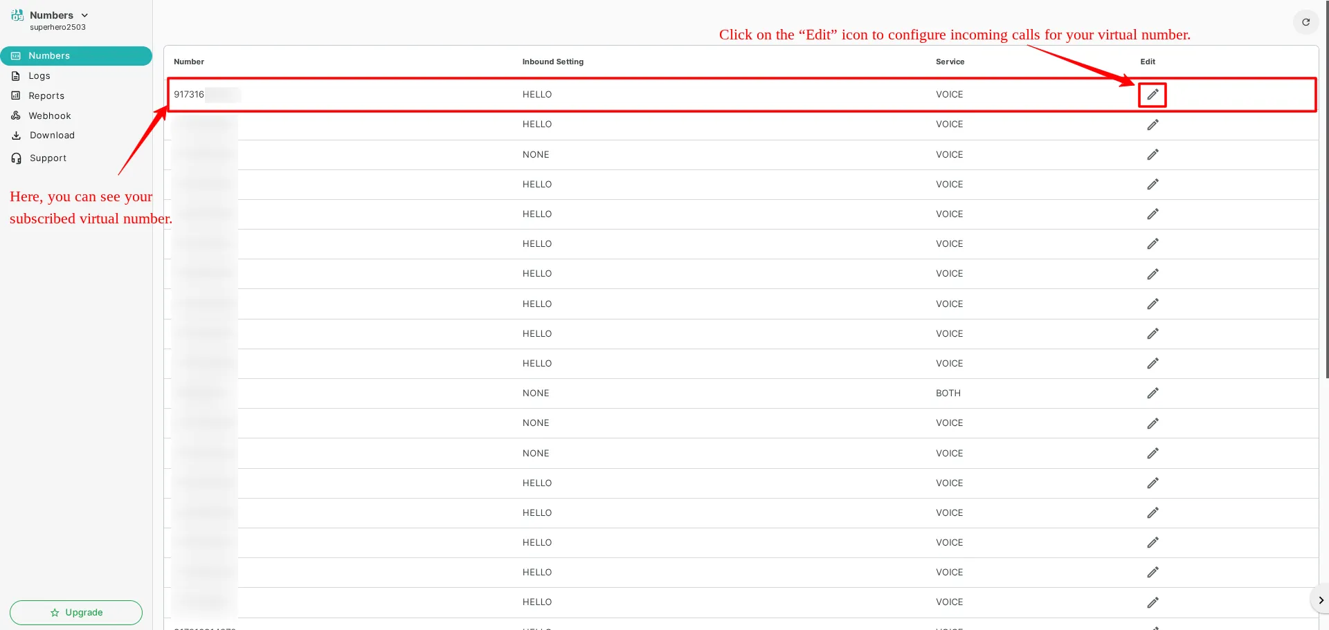 Now, you can click on the “Edit” icon to assign incoming calls to your subscribed virtual number.